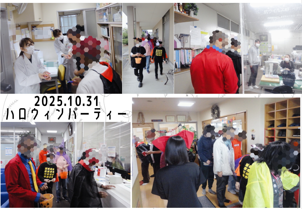 イベント【ハロウィンパーティー】 10月31日(金)、コロナでできなかったハロウィンパーティーを久しぶりに行いました! 皆さん楽しみながら、衣装を選んだり、メイクをしたりとコスプレを楽しみました。 写真を撮った後は外来や事務、栄養課のスタッフルームにお菓子を配りにいきました。 皆さん、ちょっとびっくりしながらも喜んでいただけました!( *´艸`)